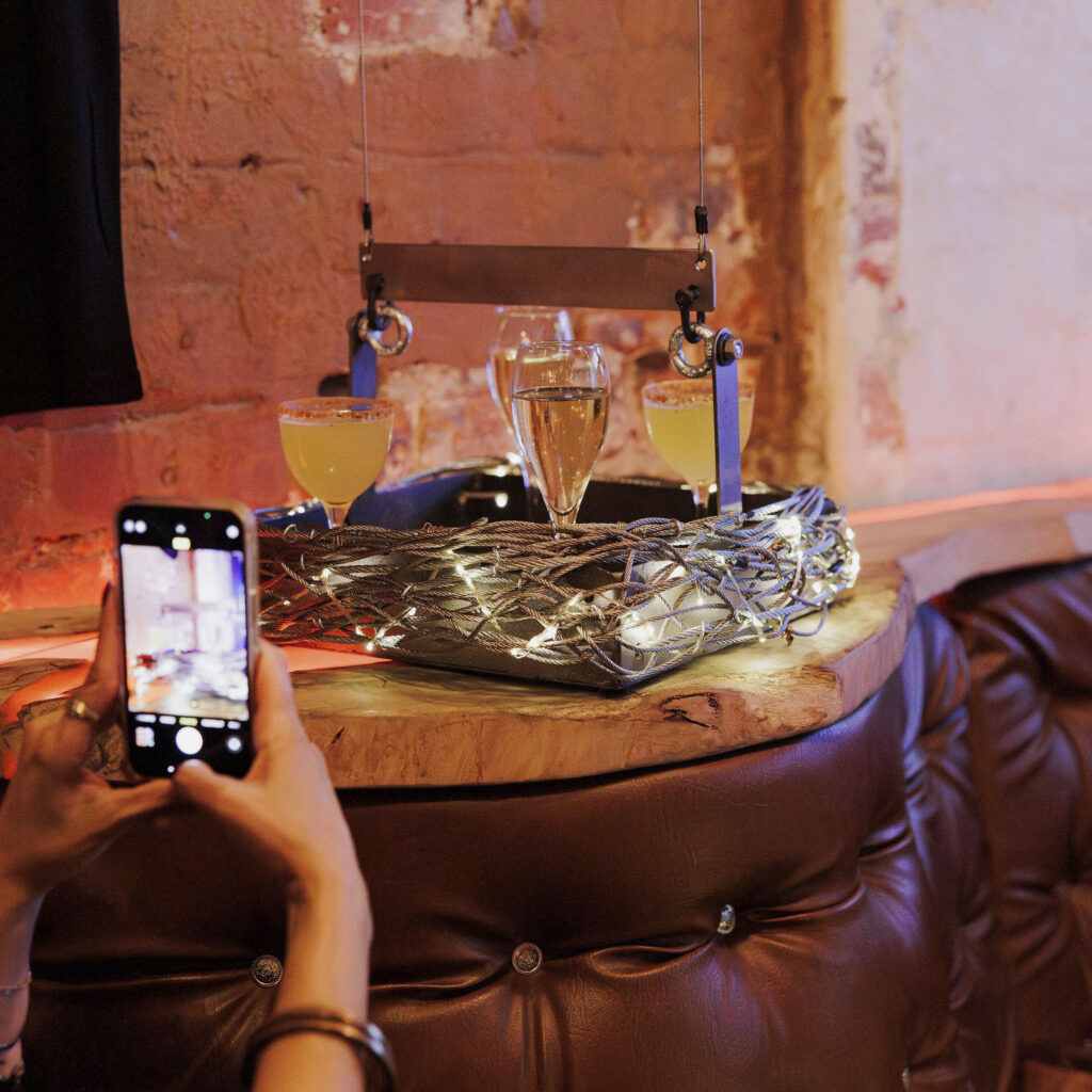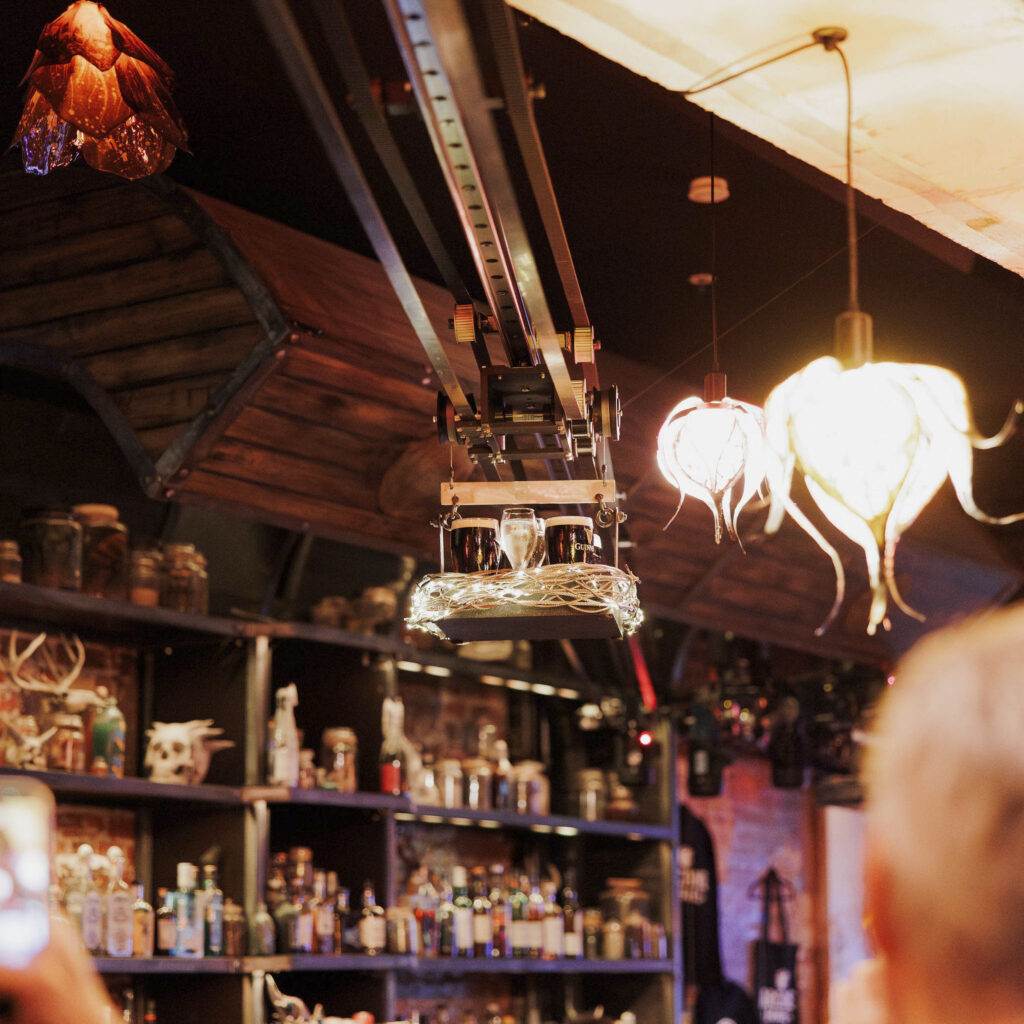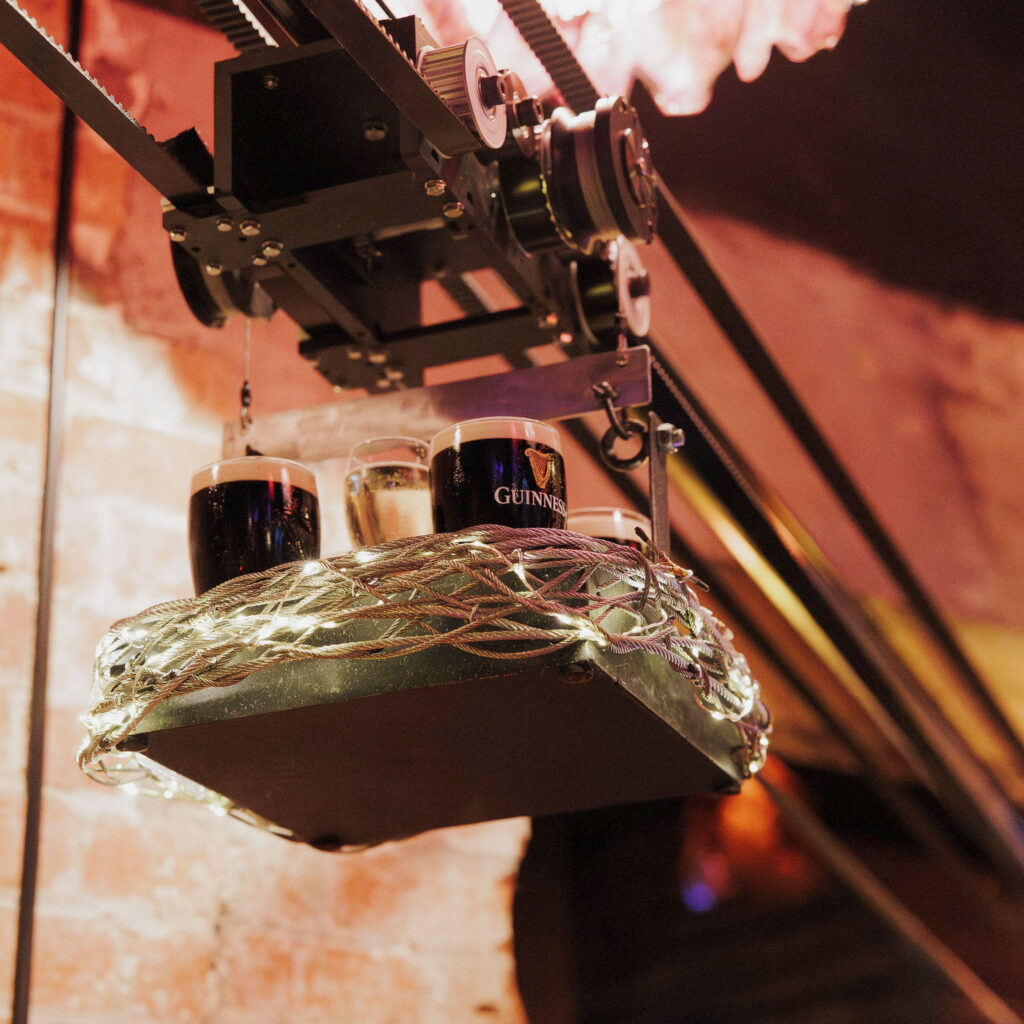 The headline feature is its overhead cocktail delivery system — drinks sent zipping across the venue straight to tables. It’s flashy, slightly ridiculous, and completely on brand. Every order becomes a small event, every arrival earns a glance, and suddenly grabbing a drink feels like entertainment rather than routine.